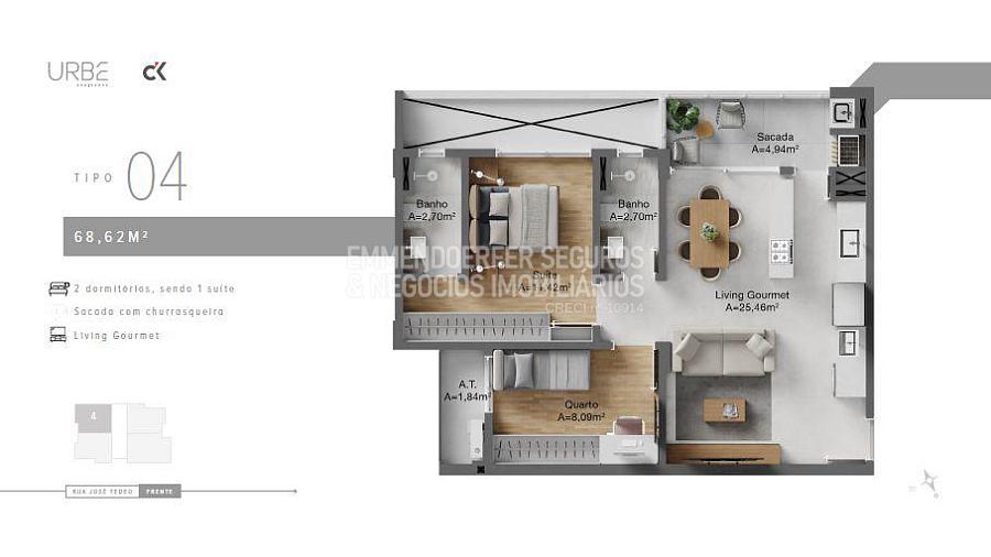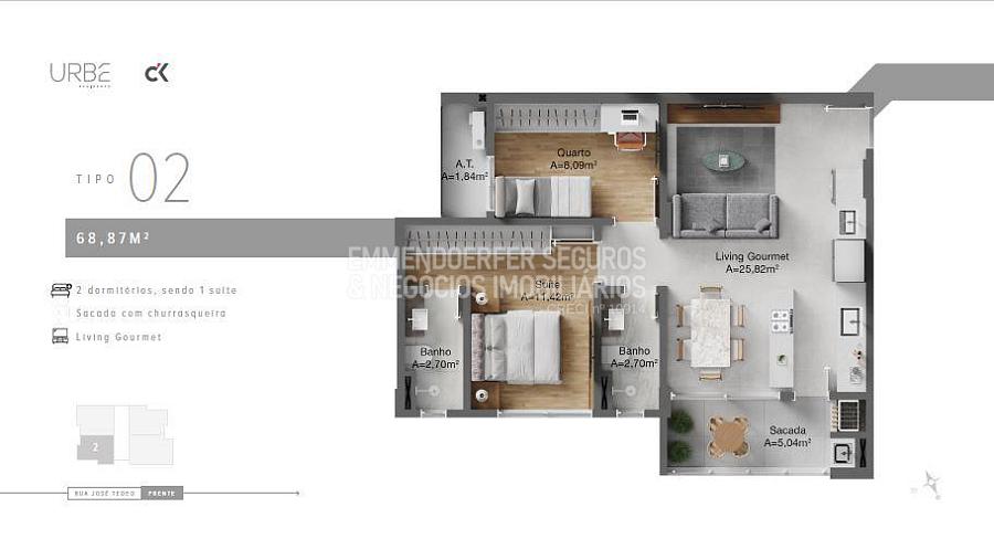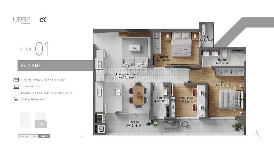 68m² com 2 dormitórios sendo 1 suíte  a 87m² com 2 dormitórios sendo 1 suíte , mais home offici , todos com Living gourmet e sacada com churrasqueira.